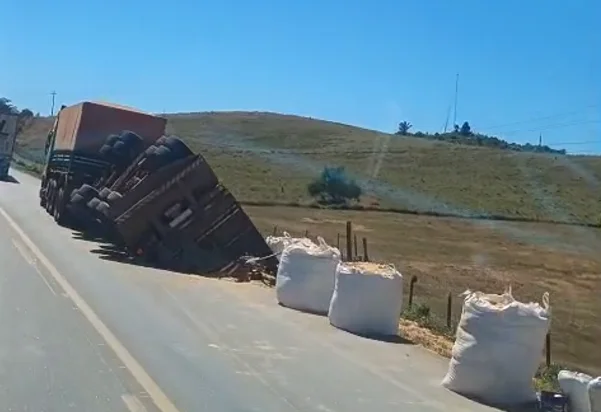 A carga transportada, cuja natureza não foi informada, caiu parcialmente sobre o acostamento e estava sendo recolhida por pessoas que utilizavam grandes sacos brancos. Ainda não há informações confirmadas sobre feridos, e o estado de saúde do motorista não foi divulgado até o momento.