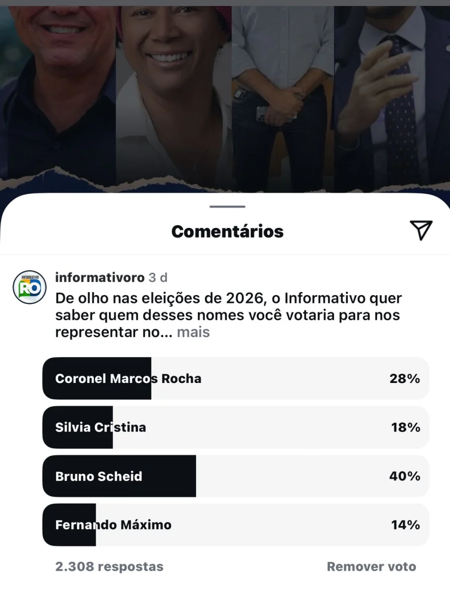 De olho nas eleições de 2026, o perfil Informativo RO realizou uma enquete nas redes sociais para saber a opinião do público sobre possíveis nomes para o Senado Federal por Rondônia. Com um total de 2309 respostas, o levantamento revelou a preferência dos seguidores por Bruno Scheid, que lidera com 40% dos votos.