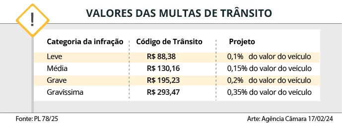 O Projeto de Lei 78/25 substitui o valor fixo das multas de trânsito por um percentual do preço de mercado do veículo. O texto, em análise na Câmara dos Deputados, altera o Código de Trânsito Brasileiro.